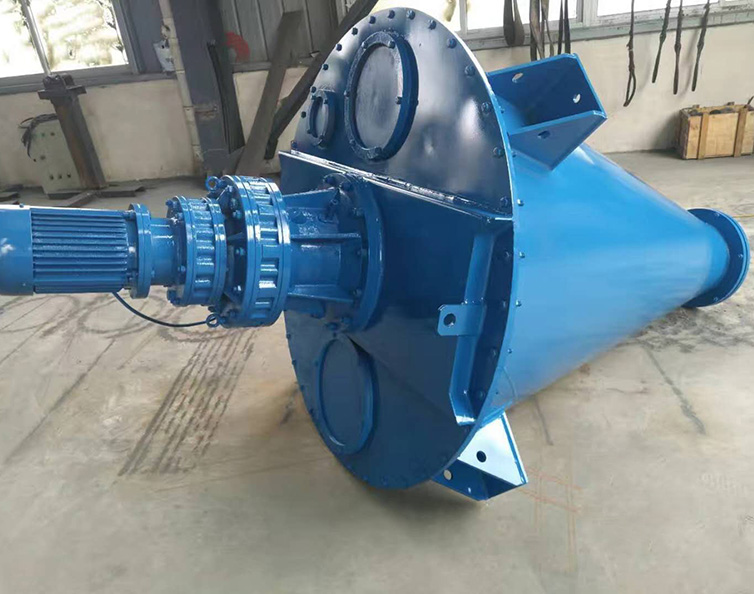 該機由擺線減速機直接驅動攪拌軸旋轉。攪拌軸由兩根與錐體吻合的螺帶及實心螺旋組成,旋轉時,螺帶將物料由下向上沿混合機錐體內壁盤旋提升。同時又由于螺帶呈錐狀,運轉時帶面上的各點線速度不同,物料在其作用下產生了不規則的對流、剪切、摻混、擴散等,形成全方位的三維運動。攪拌軸的中心是一實心面體螺旋,在運轉時將靠中心的物料提升,拋出。被拋出的物料一部分進入螺帶,而被螺帶拋出的物料又被吸收到實心面體螺旋的包絡體內而提升。如此不斷反復,使物料在極短時間內達到均勻混合。