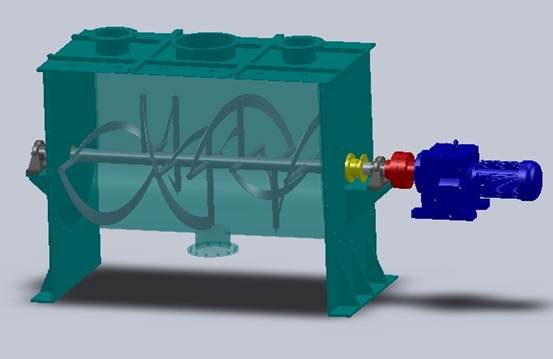 臥式螺帶混合機由安裝于攪拌軸上的內外徑螺旋帶動桶體內物料,使攪拌器在桶體內較大范圍翻動物料。攪拌器結構上,螺旋設計成內外、左右互為反螺旋,攪拌器工作時內螺旋帶動靠近軸心處物料做軸心旋轉,軸向由內至兩側推動,外螺旋帶動靠近桶壁物料做軸心旋轉,軸向由兩側至內推動,于是造成物料在桶體內對流循環、剪切滲混,完成物料在較短時間內快速均勻混合。