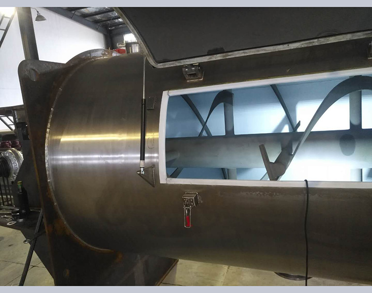 臥式螺帶混合機由U形容器、螺帶攪拌葉片和傳動部件組成;螺帶狀葉片一般做成雙層或三層,外層螺旋將物料從兩側向中央匯集,內層螺旋將物料從中央向兩側輸送,形成對流混合。螺帶混合機對于粘性或有凝聚性的粉粒體的混合以及粉粒體中添加液體及糊狀物料的混合有良好的效果,筒蓋可做成全開式門,以便于對設備進行清洗更換產品。