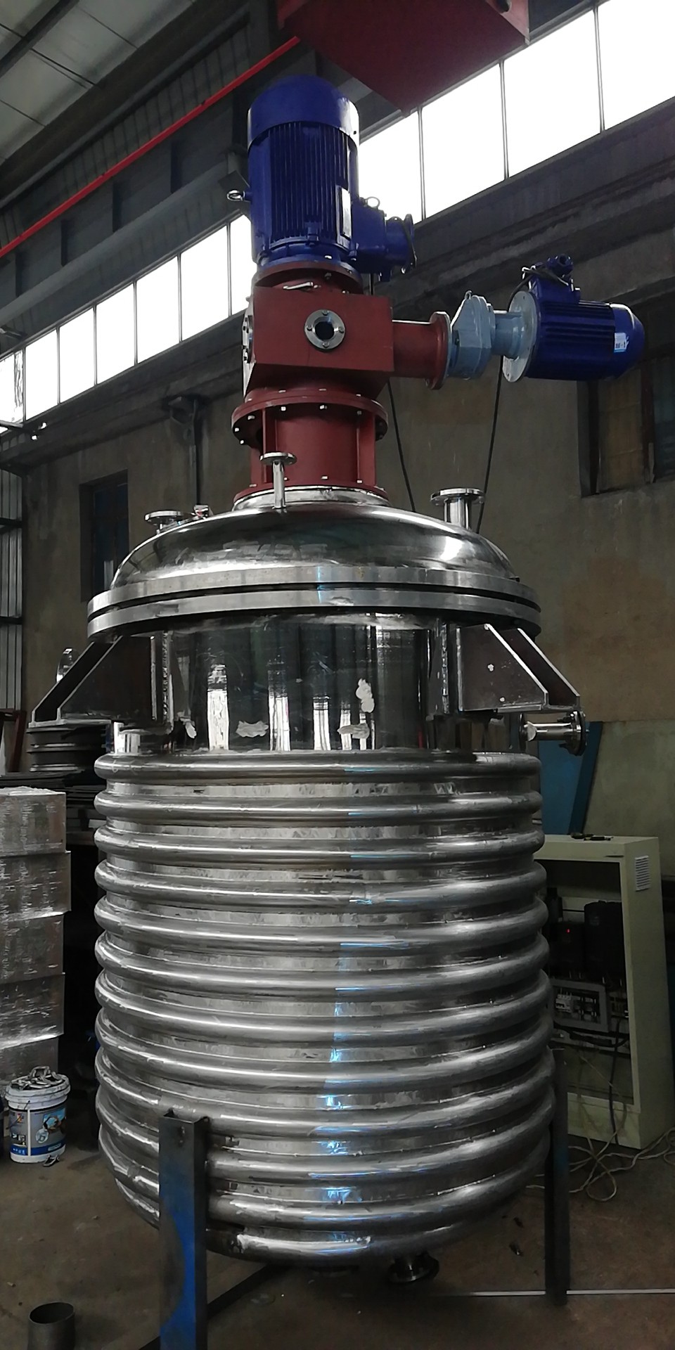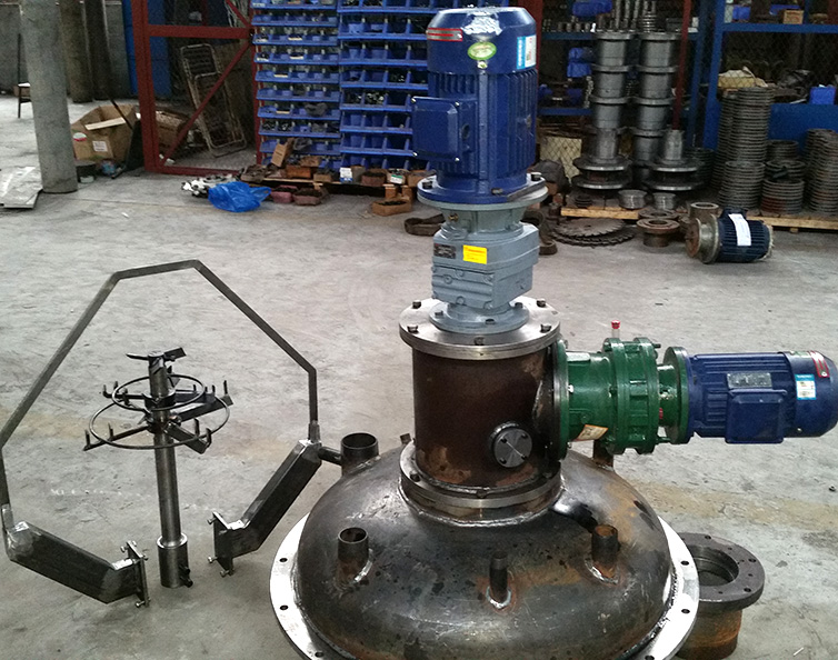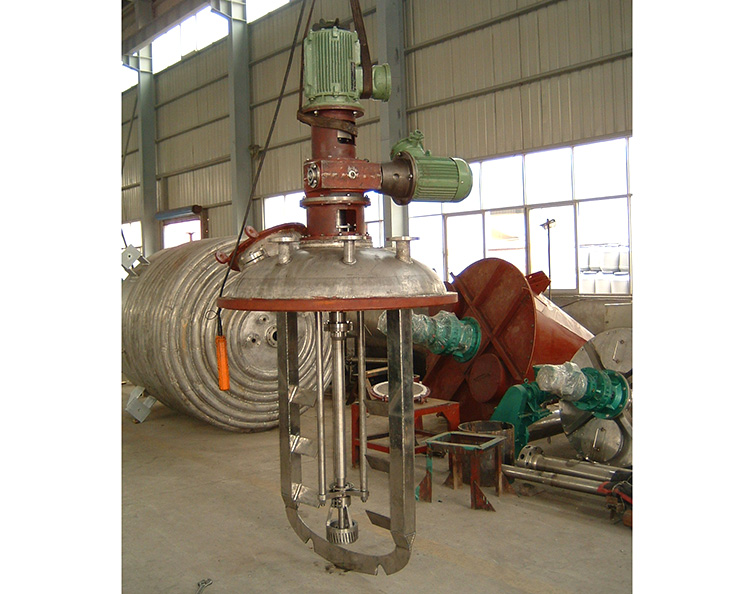 在化學工業領域,許多具有復雜工藝變化的反應涉及到高粘度流體與低粘度流體的混合、高粘度流體的乳化、其它物質在高粘度流體中的分散等問題。傳統的大直徑低轉速攪拌器(如框式攪拌器、錨式攪拌器、螺帶式攪拌器等)只能解決高粘度流體的宏觀混合問題,而分散度則嚴重不足,所以,許多單元操作需要通過長時間的攪拌來達到目的,其混合質量和效率十分低下;而以渦輪攪拌器為典型代表的許多小直徑高轉速攪拌器具有十分優良的分散性能,但其作用范圍小,滯留于筒體壁的物料無法與攪拌作用區域內的物料進行充分的傳遞,致使部分物料始終得不到充分的混合與分散。