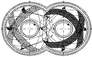 WZS型自清潔脫揮器為連續(xù)式操作,其由一個(gè)水平殼體和兩個(gè)水平軸組成。在8字形截面的殼體內(nèi),兩攪拌軸相互嚙合,雙軸同向旋轉(zhuǎn),同步轉(zhuǎn)速比為 xx:xx,分別為xx rpm(主軸)和xx rpm(清潔軸)兩個(gè)轉(zhuǎn)速(見圖1)。雙軸旋轉(zhuǎn)過程中所產(chǎn)生的動(dòng)態(tài)輪廓線確保了設(shè)備中無死角,即自清潔作用(見圖2)。為了在提供強(qiáng)力混合的同時(shí)又推動(dòng)物料(包括高粘度物料)逐漸前移,攪拌槳和U形捏合桿按螺旋狀排列,這種排列方式為高粘度的物料的軸向前移提供了推動(dòng)力,而且能阻止物料的反向流動(dòng),使物料在設(shè)備中的流動(dòng)接近平推流,從而提高了物料的脫揮效果。
