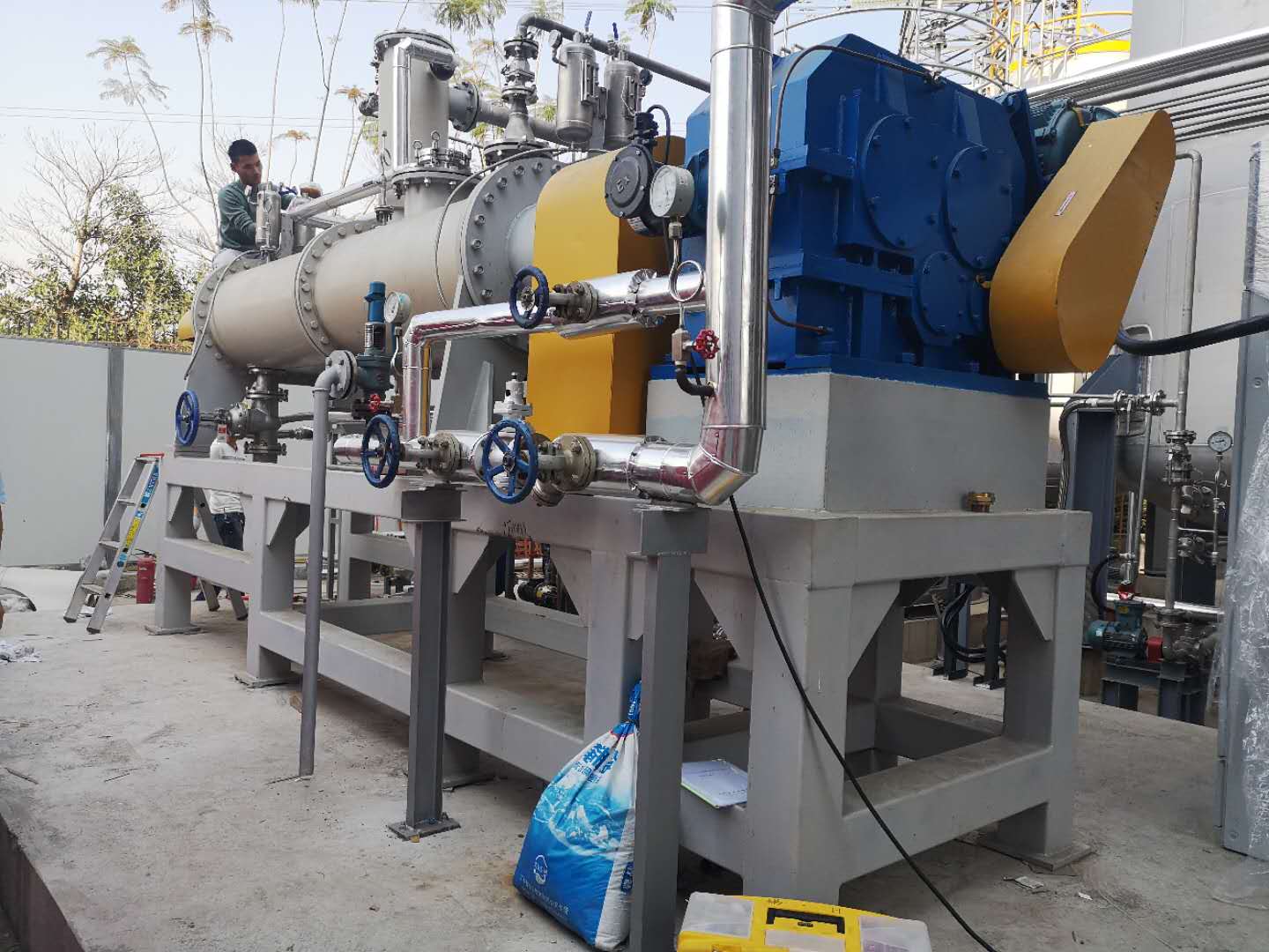 為了盡量增大單位設備容積的傳熱面積,WZS型自清潔脫揮器的殼體、攪拌軸和攪拌槳都通有導熱介質。強力的混合和捏合作用能有效地使物料更快地表面更新,該作用與具有自清潔功能的傳熱面相結合,從而確保熱、質傳遞所需的高表面更新速率。