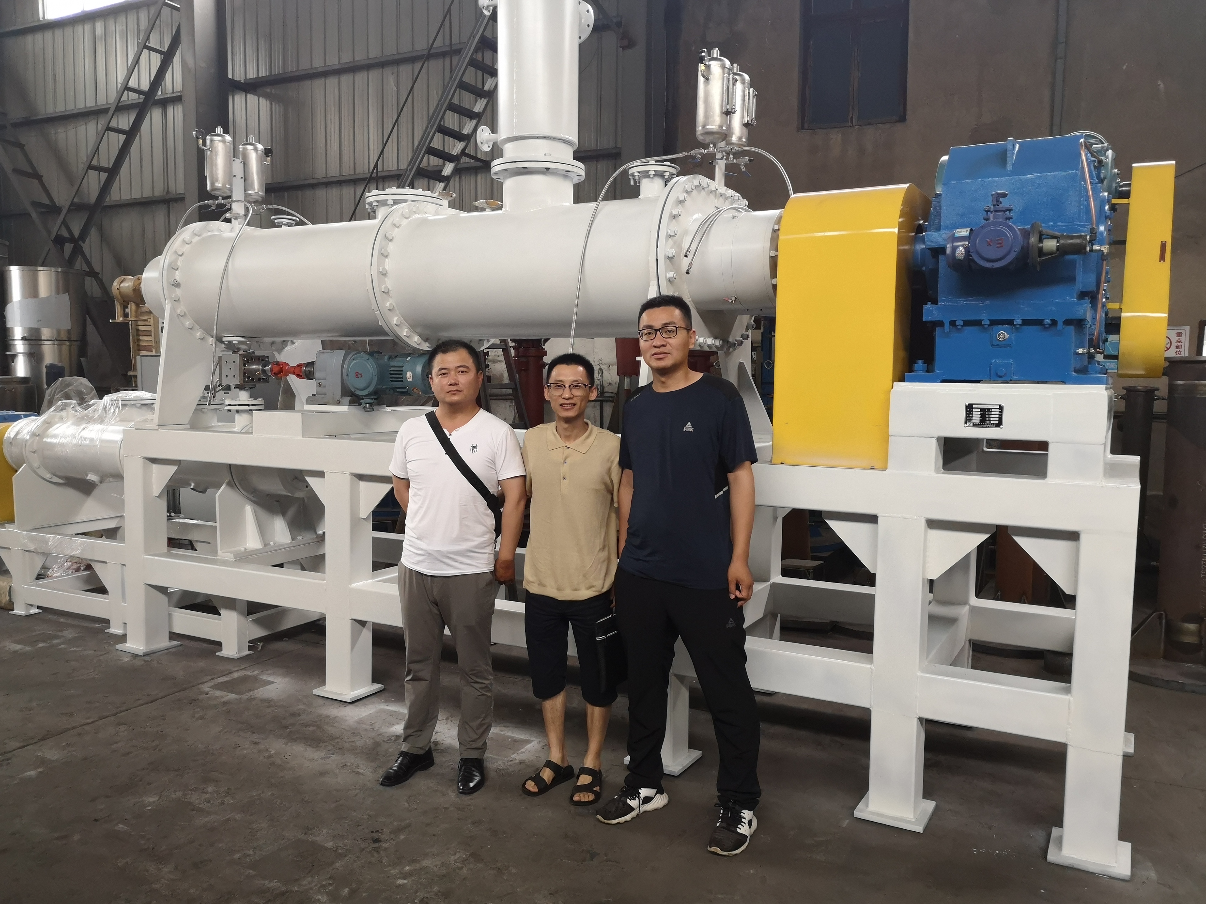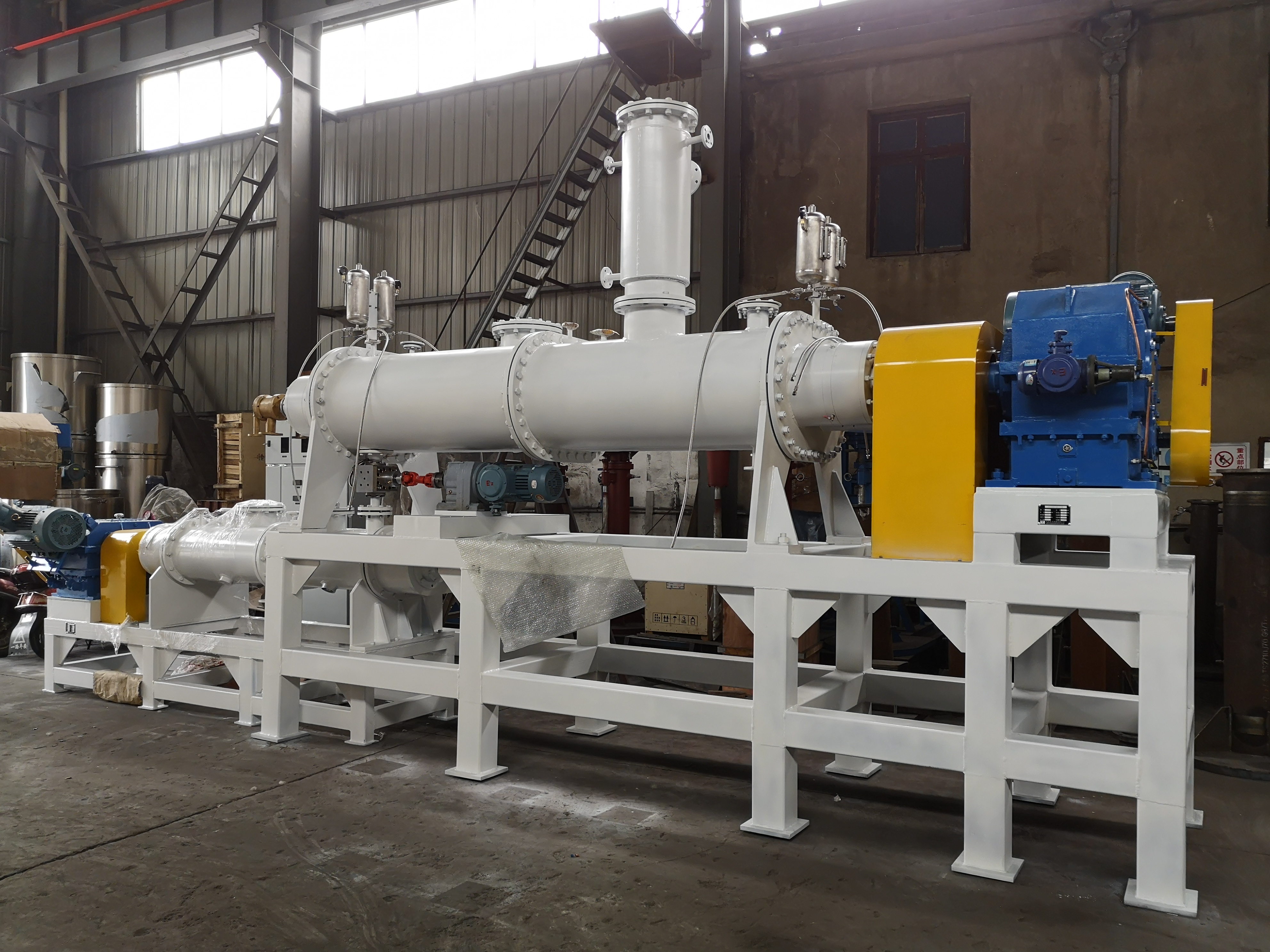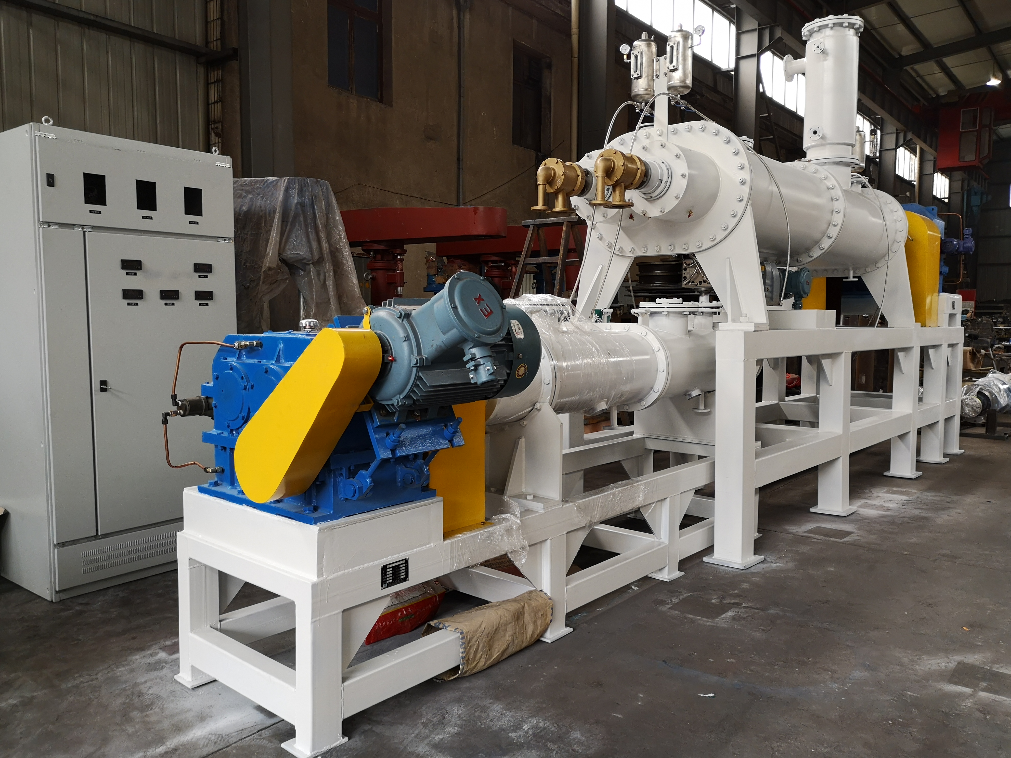 為了適應在真空狀態下的操作,專門安裝了適用于高粘度物料的齒輪泵式出料器。該出料器直接安裝在主設備上,消除了設備內的死角。齒輪泵式出料器在稍微超負荷的條件下工作,以保證物料能連續地排出,并輸入下一工段進行包裝。