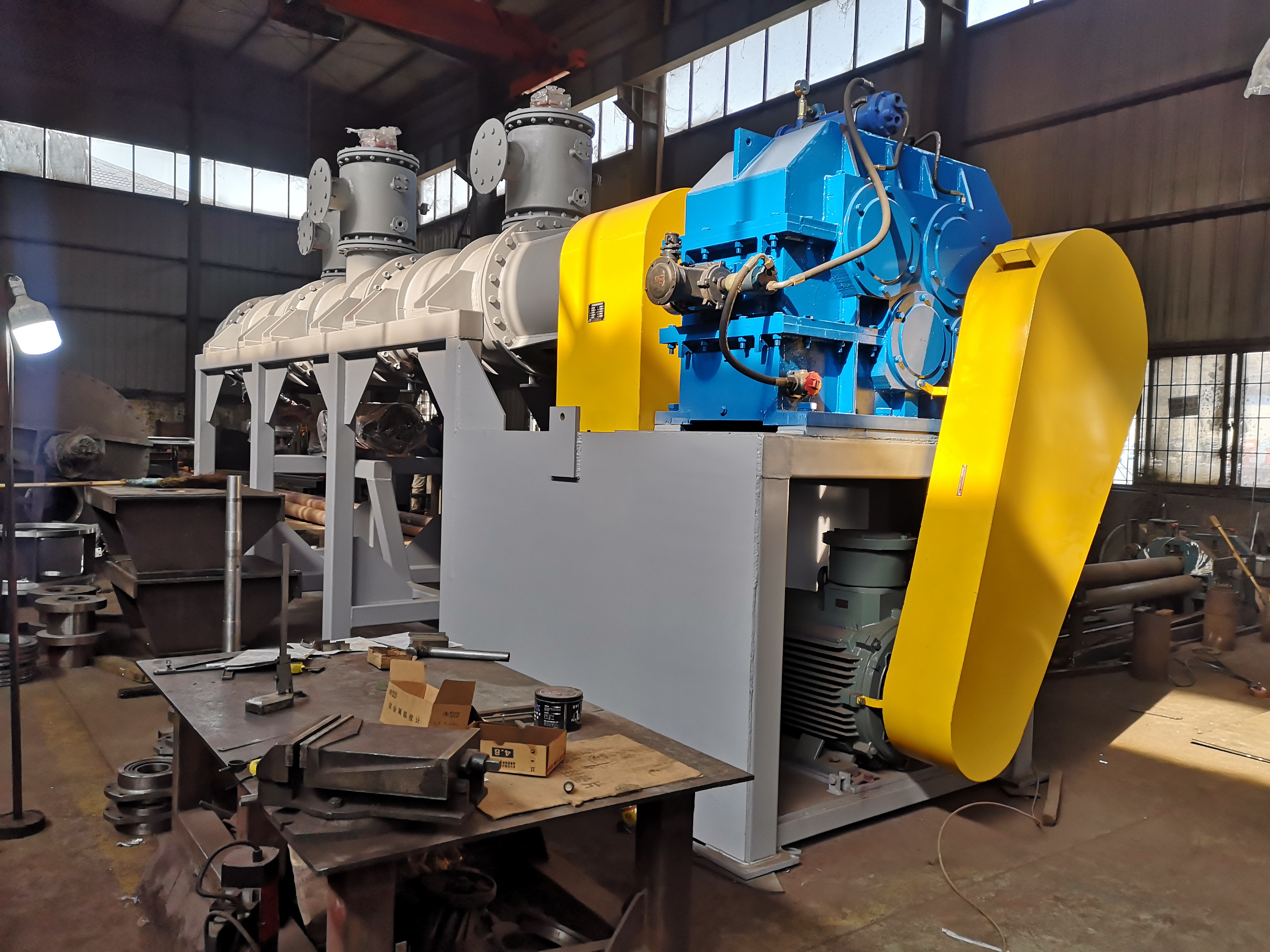 為了適應在真空狀態(tài)下的操作,專門安裝了適用于高粘度物料的齒輪泵式出料器。該出料器直接安裝在主設備上,消除了設備內的死角。齒輪泵式出料器在稍微超負荷的條件下工作,以保證物料能連續(xù)地排出,并輸入下一工段進行包裝。