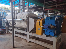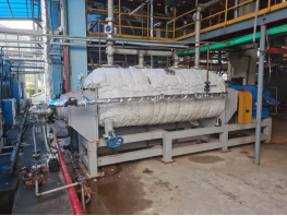 方案1:利用索孚專利產品臥式單自清潔薄膜蒸發器和臥式雙軸自清潔干燥機在高溫330C°以下和真空-0.095MPa左右條件下,回收大部分有用高沸物溶劑產品,最終殘留量≤0.2%,再將釜殘廢鹽等直接干燥固化破碎處理;(物料特性:溶劑脫除完畢直接固相析出和通過高溫催化裂解成固相物料,例如:廢鹽釜殘,苯二酚釜殘,甲基丙烯酸釜殘,二甲基-咪唑啉酮釜殘,亞硫酸氫鉀鹽干燥,二甲基亞砜(DMSO)釜殘處理,染料中間體廢活性炭干燥處理,污泥等等)
