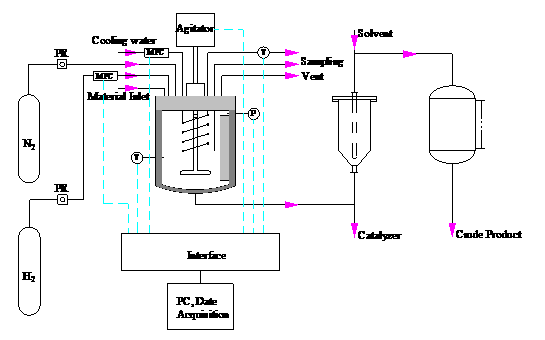 全套催化加氫模試系統設計壓力6.4Mpa、溫度200°C,主要由24L的主反應器系統、PLC控制系統、催化劑過濾回收系統等組成。其工作流程為:反應開始前,把原料、溶劑、催化劑混合后抽入釜內,釜內的空氣經氮氣置換后,往釜內通入經氫氣質量流量計計量后的氫氣,通過導熱油加熱使釜溫上升,當釜內壓力和溫度達到設定值時,啟動攪拌電機開始反應。反應開始后,停導熱油加熱,開冷卻水冷卻,冷卻水量由水質量流量計進行準確計量。通過控制氫氣管路和冷卻水管路上的氣動調節閥開度使反應在恒壓恒溫下進行。反應過程中,通過精細設計的取樣管路可在帶壓下取得不含催化劑的液相樣品。反應結束后,通過釜內余壓使釜內料液經過催化劑過濾器,被過濾器攔截下來的催化劑通過溶劑洗滌后回收利用,反應產物和溶劑則進入產品儲罐進行進一步的分離、提純。
